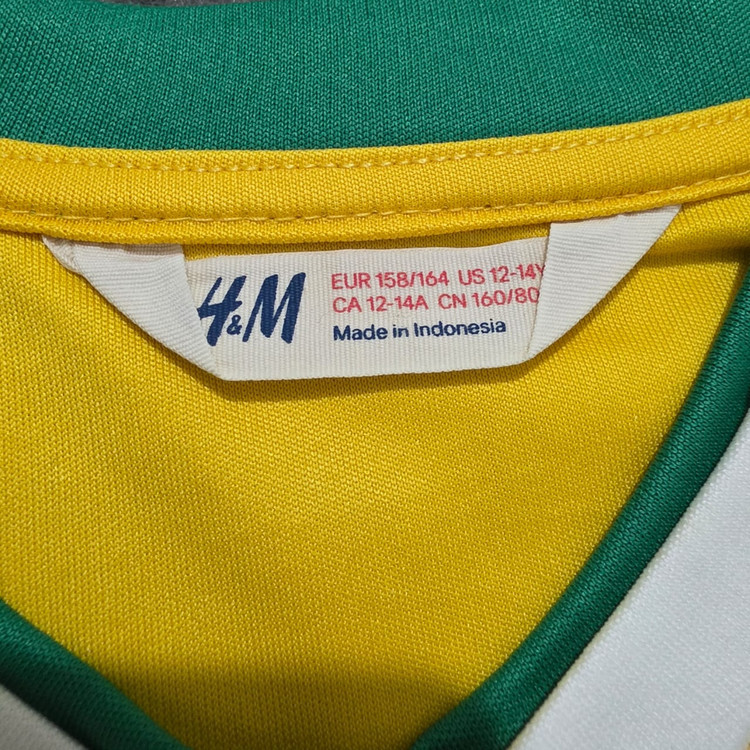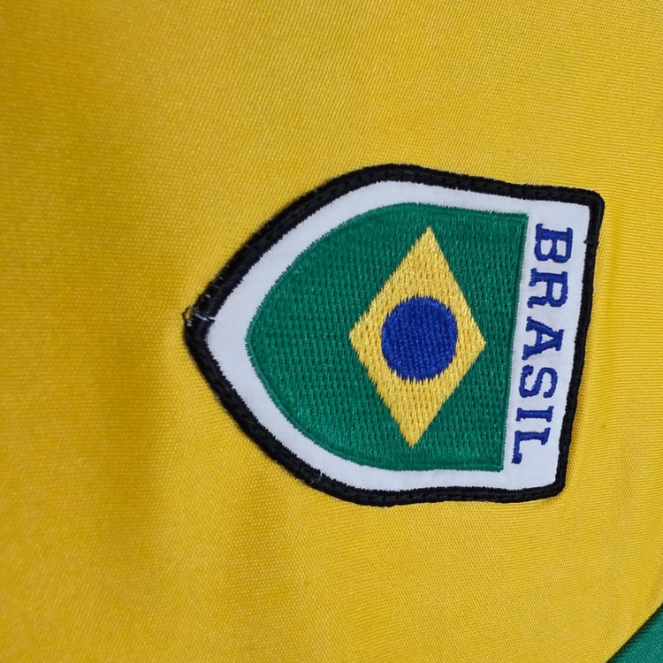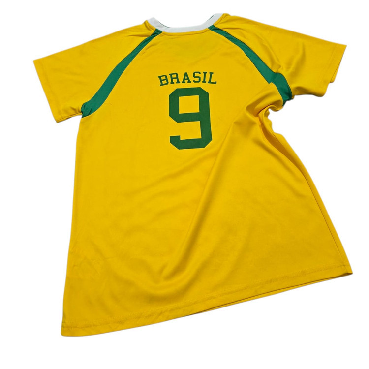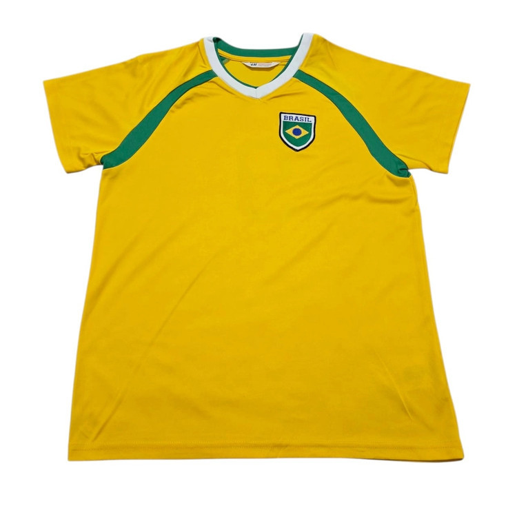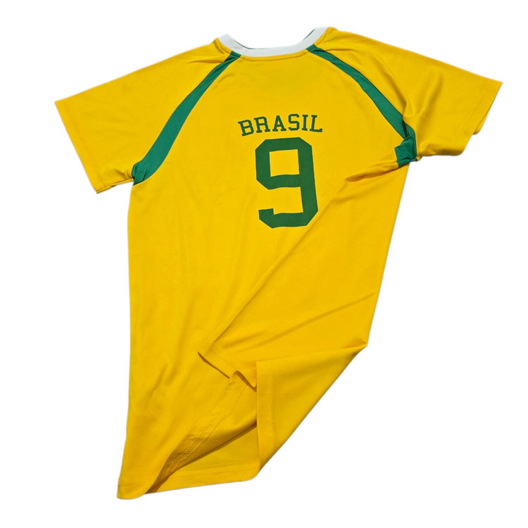 ین یک تیشرت ورزشی به رنگ زرد است که رنگ اصلی تیم ملی فوتبال برزیل است. روی سینه تیشرت، یک نشان ورزشی شبیه به نشان فدراسیون فوتبال برزیل دیده میشود که شامل یک سپر سبز و آبی با نوشته "BRASIL" است. همچنین، نوارهای سبز رنگی از یقه به سمت آستینها امتداد یافتهاند که تکمیلکننده رنگهای پرچم برزیل هستند. این تیشرت یک پیراهن فوتبال (جرسی) باشد که هواداران تیم برزیل از آن استفاده کنند.