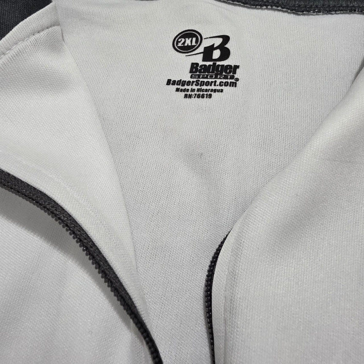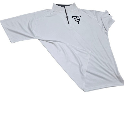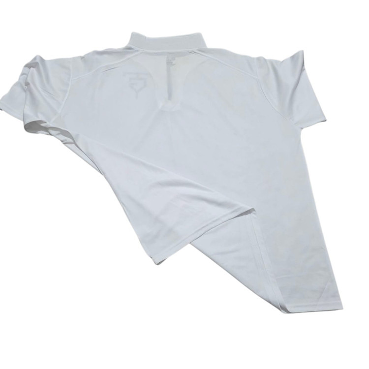 این یک تیشرت آستین کوتاه به رنگ سفید است. در قسمت یقه یک زیپ کوتاه مشکی رنگ دارد و زیر آن یک لوگوی مشکی یا طرحی شبیه به حرف "A" دیده میشود. جنس پارچه ورزشی و سبک باشد. این تیشرت میتواند برای فعالیتهای ورزشی یا به عنوان یک لباس راحتی و روزمره استفاده شود.